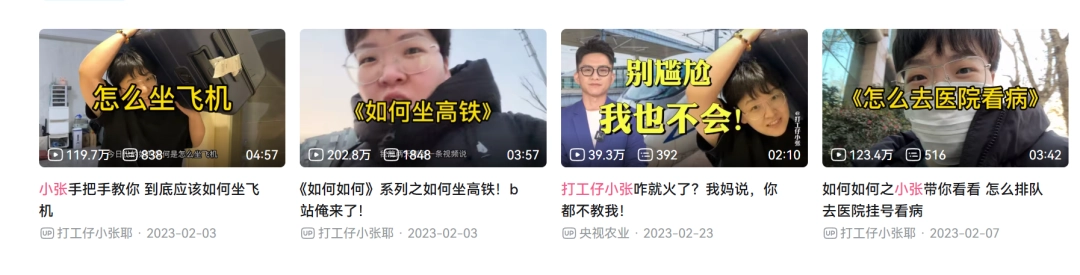 2023岁首,UP主“打工仔小张耶”便因“如何乘坐飞机、高铁”“如何去病院看病”等视频爆火,以至还被央视农业报说念过。