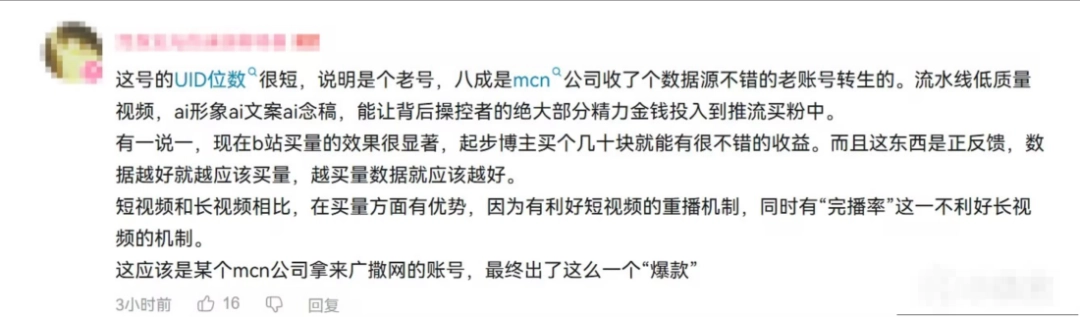 也有东说念主指出具体问题,通过UID位数来判断该账号可能是数据可以的老账号转生,而非本年二月冒出来的新东说念主。再笔据其活水线化的AI形象、AI案牍、AI念稿,以及看上去有些不日常的播放量数据,判断可能存在一个幕后推手。