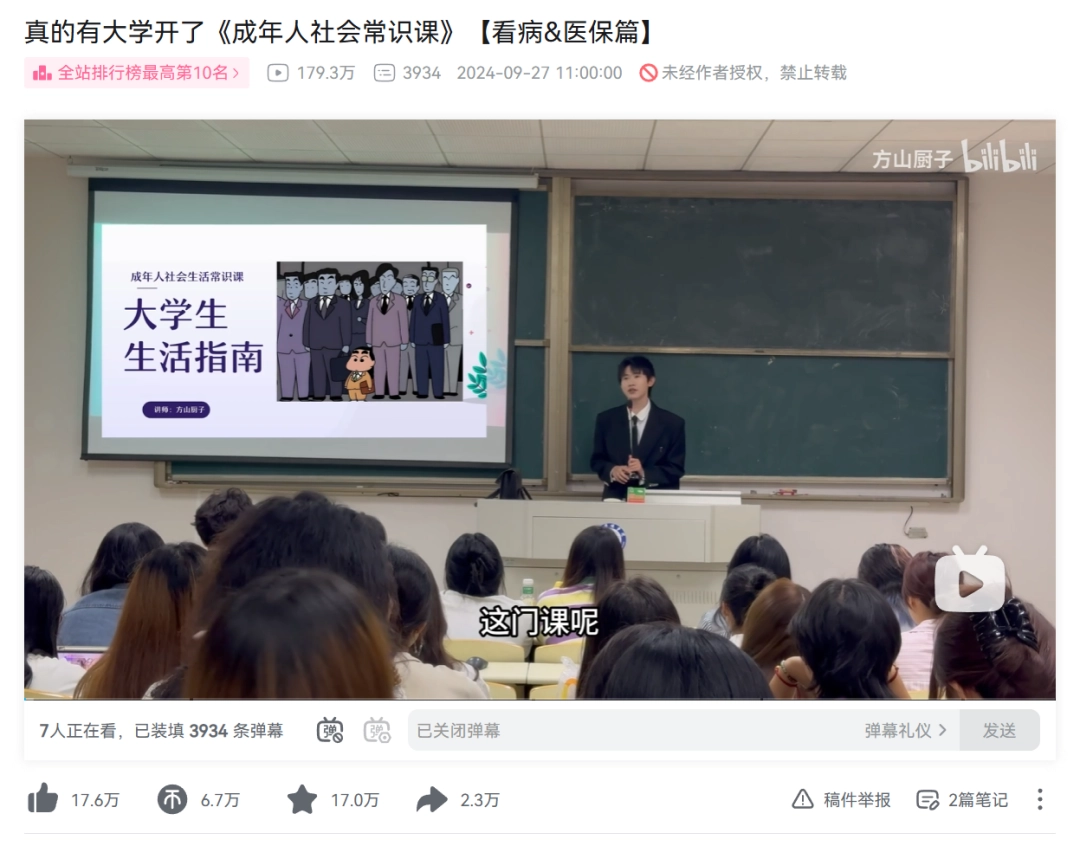 而2024年,南京传媒学院还开设了一门名为《大学生生活指南》的公选课,讲课东说念主一样在B站发布了好意思满的摄像,包括看病、社保、租房、如何乘坐高铁飞机等诸多生活学问。值得一提的是,这部视频还曾登上过全站排名榜第十名,播放量也不俗。