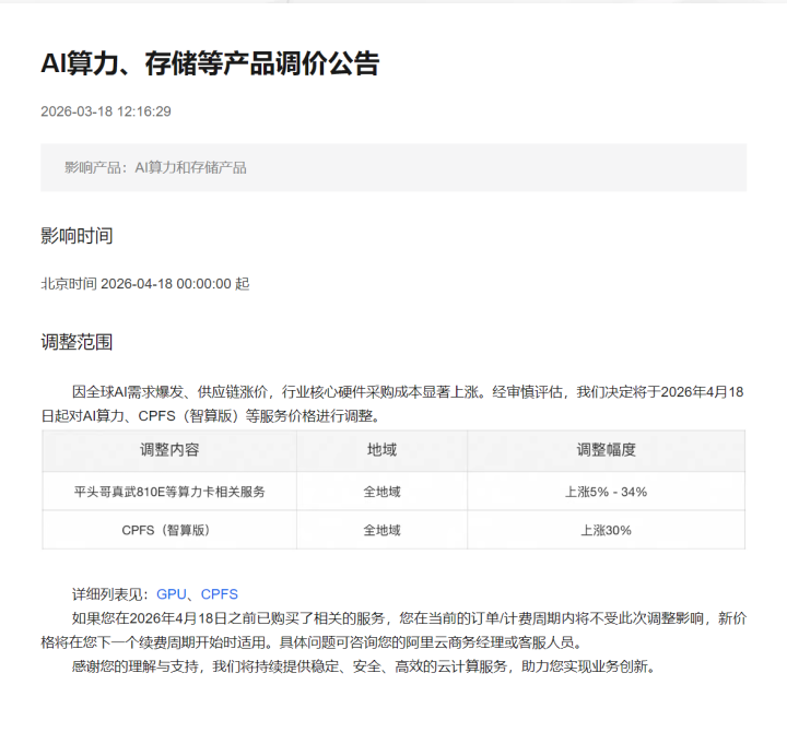 第一件:阿里云布告加价,部分产物最热潮了34%。云计较这个行业,曩昔几年一直在打价钱战,谁降价降得多谁就能抢客户。倏得加价,按正常逻辑应该是自掘坟墓——但阿里的股价,加价本日反而涨了。