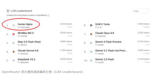 然后这个中国的大型Hunter Alpha就杀穿了OpenRouter 榜单,跨越Deepseek、GLM、Gemin等,登顶日榜、周榜,调用量迫害1万亿tokens,许多厂商皆抢着接入。