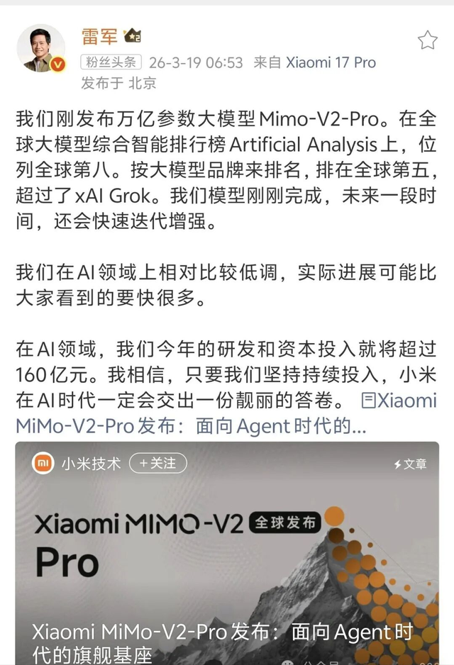 此外,雷军发文称,Mimo-V2-Pro在全球详细名次上排第8,品牌上排第五,跨越了xAI Grok。