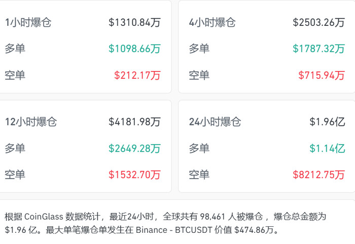 CoinGlass数据透露,最近24小时,大家共有超9.8万东谈主爆仓,爆仓总金额为1.88亿好意思元。其中,大部分为多单爆仓。