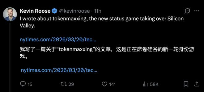 《纽约时报》科技专栏作者KevinRoose在著作提到,一场名为智元刷满(Tokenmaxxing)的新身份游戏正在席卷硅谷白领。