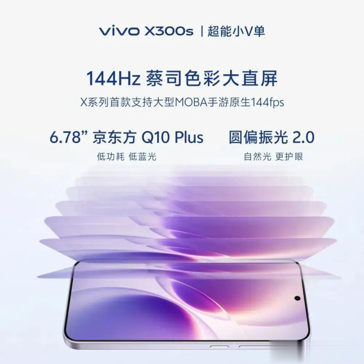 其他规格部分,这款vivo X300s将配备144Hz蔡司颜色大直屏,X系列首款144Hz高刷,X系列首款复古大型MOBA手游原生144FPS的机型,京东方Q10 Plus材质的6.78 英寸大屏,同期复古圆偏振光2.0,当然光更护眼。