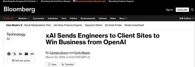 [环球网科技笼统报说念]3月21日音讯,据彭博社报说念,马斯克旗下东说念主工智能公司xAI近日推出极具针对性的企业事业政策,通过交代工程师入驻潜在企业客户办公时局提供定制化事业的神气,从OpenAI、Anthropic等行业竞争敌手手中争夺交易客户资源,此举也折射出行家头部AI企业在交易化变现赛说念的竞争日趋热烈。