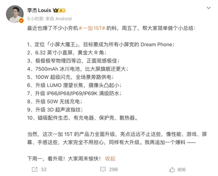 一加15T立地要不才周发布,详备成就依然完全曝光了,属于小屏小钢炮机器,屏幕尺寸是6.32英寸和近邻小米17圭臬版是对位机型。