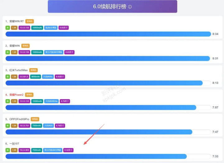 小屏+大电板,续航天然是可以。当今新评科技的续航数据也依然出来了,7小时33分,位列排名榜第六位,比自家老迈一加15如实要好。