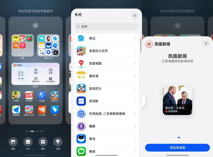 桌面卡片:双指合手合桌面,点“卡片”搜索期骗添加;或者长按期骗图标点“卡片”选面貌添加就行。