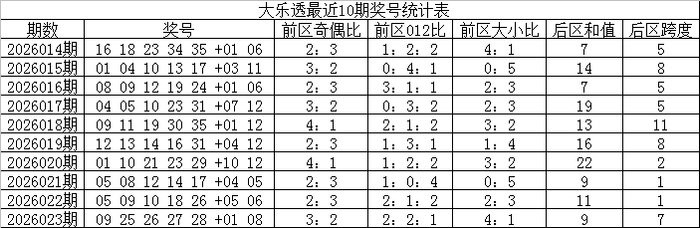 大乐透第2026023期奖号为:09 25 26 27 28+01 08。当期前区奖号012路比为2:2:1,冷热比为3:2,包含2个重号:09、26,包含连码组合25 26 27 28,后区开出一奇一偶、一大一小组合。