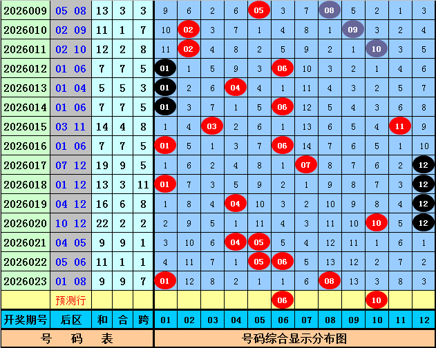 后分辨析:上期后区开出两码01和08,分别遗漏了4期和13期,最近10期后区奖号大小个数比为8:12,奇偶个数比为9:11,本期后区审视号码06、07、08、10、12,精选两码06、10。