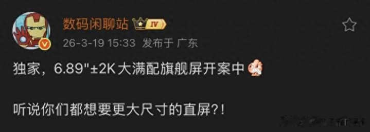 传闻你们王人念念要更大尺寸的直屏?今天,数码谈天站的一条爆料,让宽阔直屏党蓦然精神了。“独家,6.89”±2K大满配旗舰屏开案中[偷乐]”短短一句话,信息量繁密。6.89英寸、2K分裂率、旗舰级直屏——这三个重要词组合在一谈,基本不错提前锁定本年下半年的爆款竖立 。