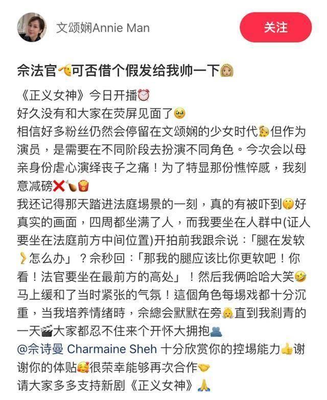 文颂娴说:当我培养神色时,阿佘总会默然在旁。直到我达成的一天,宇宙齐忍不住来了个畅怀大拥抱,@佘诗曼 Charmaine Sheh。畸形玩赏你的控埸才能。谢谢你的体恤,很运气大致再次诱骗,请宇宙多多营救新剧《正义女神》。