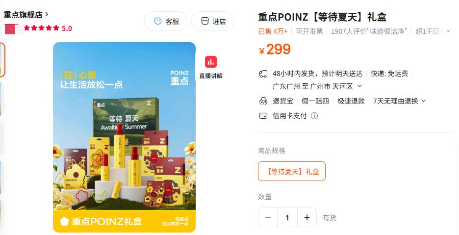 几大电商平台的相关旗舰店内居品并未几,基本独一9个SKU。其中,最受宽待的是一套售价299元的“恭候夏天”礼盒,内含驱蚊花露珠、植物精油手环、植物精油贴等7款居品。这套礼盒在部分旗舰店内的销量已超4万。