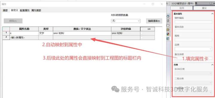 6、创建自界说属性卡,属性卡里填写的属性会自动映射到零件的属性里,再映射到工程图的标题栏中;