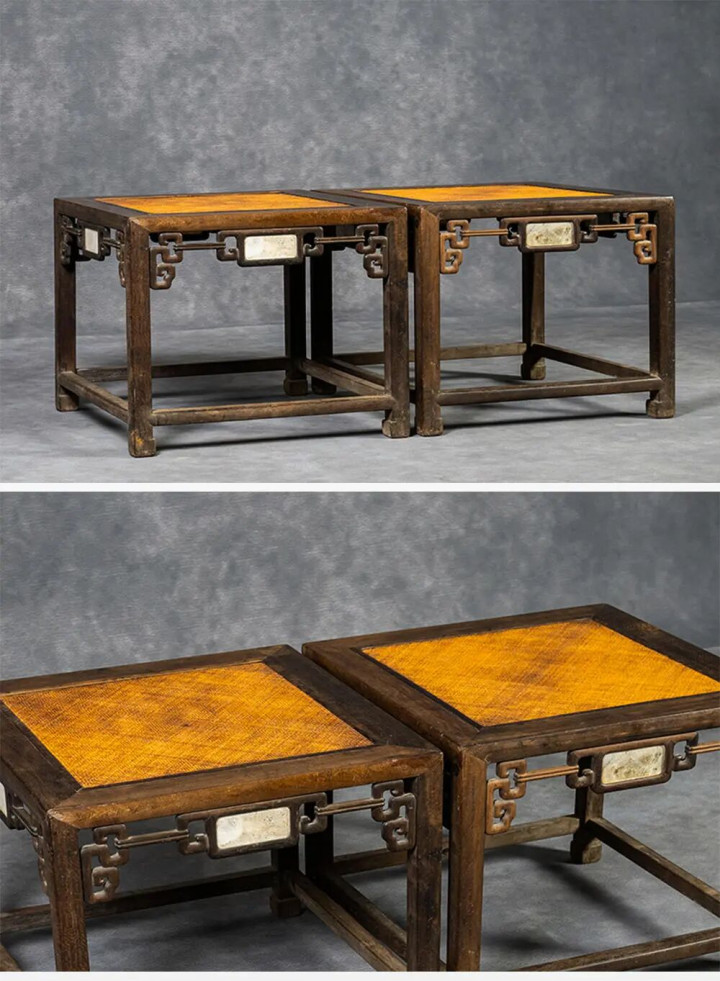 清中期 紫檀镶云石拐子纹四面平大禅凳(一双)